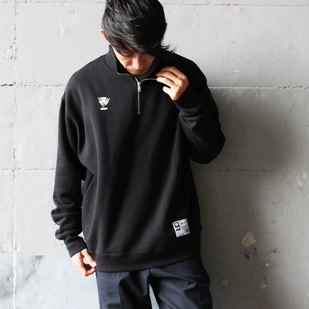 ルーズフィットシルエットのハーフジップスウェット 裏地は保温性と着心地の良さがある起毛素材 旬なアイテムで男性女性幅広く着こなせるユニセックスアイテムです。 <モデル> 178cm/痩せ型 XLサイズ/着用(オーバーサイズ感有り)