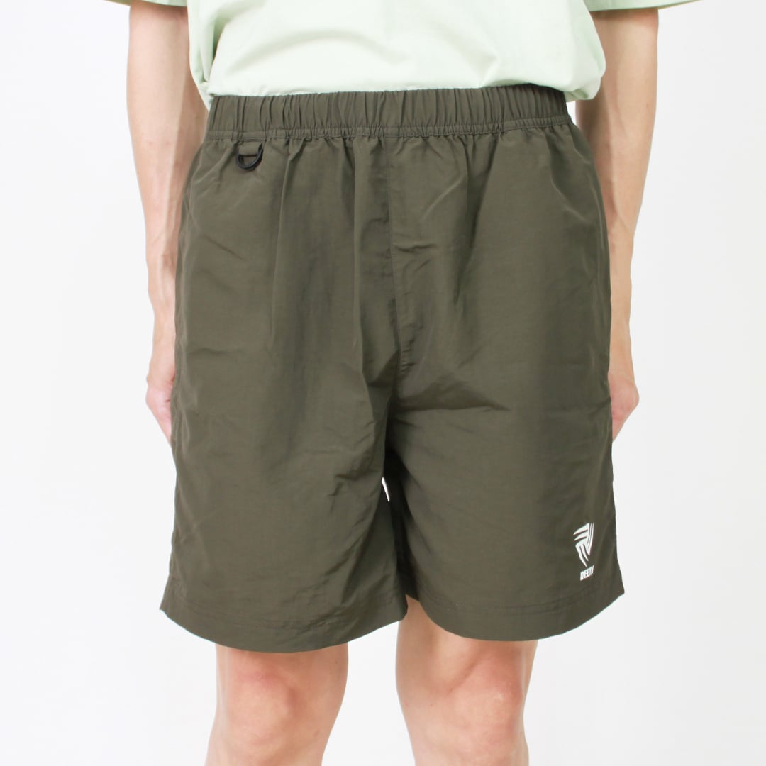 張りのあるナイロン生地を使用し、裏地が無いため軽量で快適に過ごせます。ウエスト部分はゴムと紐で調整可能なので、リラックスして着用できるデザインです。